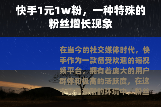 在当今的社交媒体时代,快手作为一款备受欢迎的短视频平台,拥有着庞大的用户群体和极高的活跃度,在这个竞争激烈的环境中,粉丝数量往往被视为衡量一个账号影响力和价值的重要指标之一,而“快手1元1w粉”的现象也随之悄然兴起。