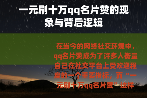 在当今的网络社交环境中,qq名片赞成为了许多人衡量自己在社交平台上受欢迎程度的一个重要指标,而“一元刷十万qq名片赞”这样的服务也悄然兴起,吸引了众多用户的目光。