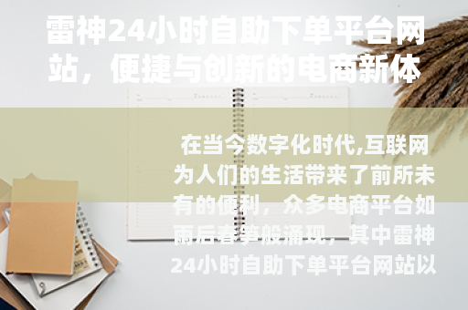 在当今数字化时代,互联网为人们的生活带来了前所未有的便利,众多电商平台如雨后春笋般涌现,其中雷神24小时自助下单平台网站以其独特的服务模式吸引了众多用户的关注。