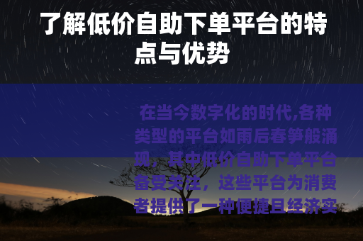在当今数字化的时代,各种类型的平台如雨后春笋般涌现,其中低价自助下单平台备受关注,这些平台为消费者提供了一种便捷且经济实惠的购物方式,满足了不同人群的需求。