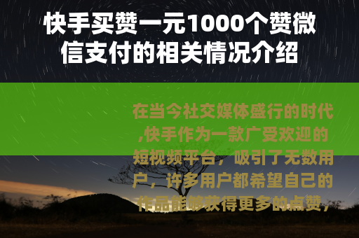 对于一些快手创作者来说,点赞数量在一定程度上代表着作品的受欢迎程度和影响力,当看到有这样看似低成本高回报的买赞方式时,难免会有些心动,这种一元1000个赞的交易模式,通过微信支付,操作起来相对便捷,用户只需要在相关的平台或商家处下单,按照指示完成微信支付,就可以期待自己的作品点赞数快速增长。
