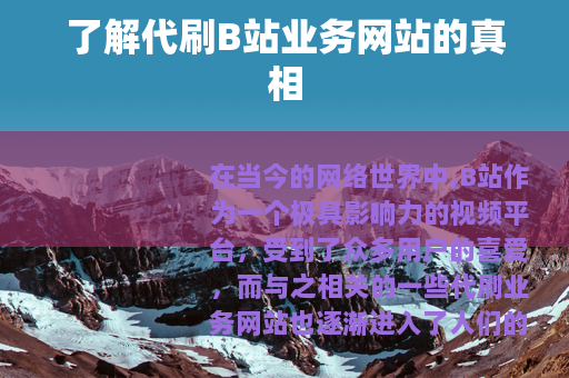 在当今的网络世界中,B站作为一个极具影响力的视频平台,受到了众多用户的喜爱,而与之相关的一些代刷业务网站也逐渐进入了人们的视野。