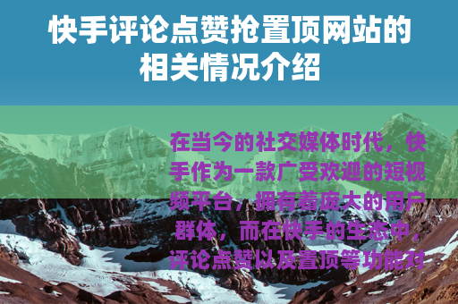 快手评论点赞抢置顶网站在快手的生态中扮演着一个独特的角色,它们为用户提供了一种额外的推广和互动手段,在一定程度上帮助用户提升了在平台上的影响力和关注度,但同时,用户在使用这些网站时要保持清醒的头脑,理性看待其服务,注重自身内容质量的提升和合规运营,才能在快手上实现真正的长久发展,在这个充满机遇和挑战的短视频平台上绽放自己的光彩,收获更多的粉丝和认可,为自己的创作之路打下坚实的基础,让自己的作品在众多优秀的短视频中脱颖而出,获得更广泛的传播和更高的价值。 能满足您的需求,您可以根据实际情况进行调整和修改,需要注意的是,在实际的网络环境中,利用非官方正规途径获取点赞、置顶等行为可能存在违反平台规定等风险,平台通常会对这类违规行为进行打击和处理,以上文章仅为基于设定要求的创作内容,不构成对任何违规行为的鼓励或支持。