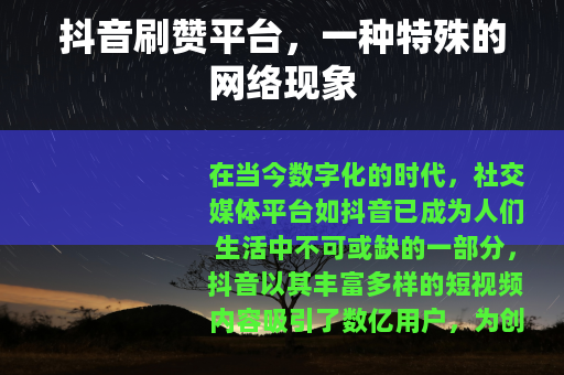 在当今数字化的时代,社交媒体平台如抖音已成为人们生活中不可或缺的一部分,抖音以其丰富多样的短视频内容吸引了数亿用户,为创作者提供了展示自我和获得关注的机会,而在这个生态中,抖音刷赞平台也悄然兴起,成为了一个备受关注的话题。