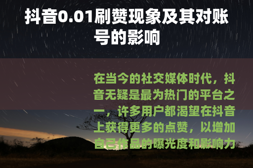 在当今的社交媒体时代,抖音无疑是最为热门的平台之一,许多用户都渴望在抖音上获得更多的点赞,以增加自己作品的曝光度和影响力,抖音0.01刷赞的现象逐渐引起了人们的关注。