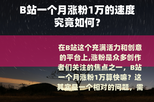 在B站这个充满活力和创意的平台上,涨粉是众多创作者们关注的焦点之一,B站一个月涨粉1万算快嘛?这其实是一个相对的问题,需要从多个角度来分析。
