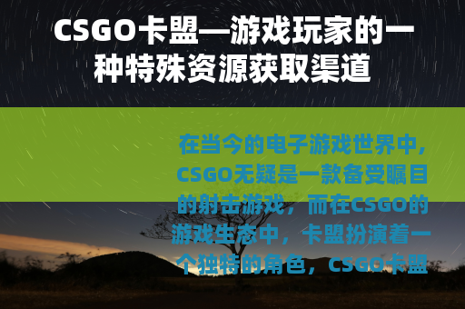 在当今的电子游戏世界中,CSGO无疑是一款备受瞩目的射击游戏,而在CSGO的游戏生态中,卡盟扮演着一个独特的角色。