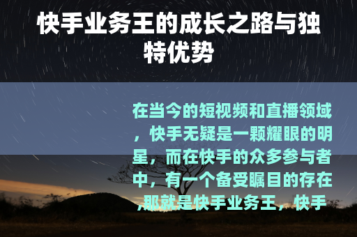 在当今的短视频和直播领域,快手无疑是一颗耀眼的明星,而在快手的众多参与者中,有一个备受瞩目的存在,那就是快手业务王。