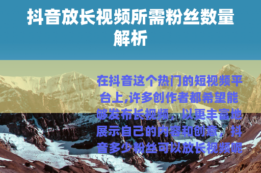 在抖音这个热门的短视频平台上,许多创作者都希望能够发布长视频,以更丰富地展示自己的内容和创意,抖音多少粉丝可以放长视频呢?