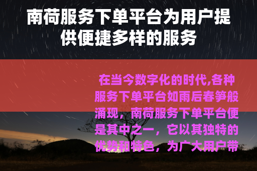 在当今数字化的时代,各种服务下单平台如雨后春笋般涌现,南荷服务下单平台便是其中之一,它以其独特的优势和特色,为广大用户带来了诸多便利和价值。