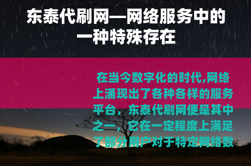 东泰代刷网作为网络服务中的一种特殊存在,在一定程度上改变了网络数据的格局,为一些用户和企业提供了一种快速提升影响力的途径,但同时,它也需要在合法合规和道德的框架内不断完善自己,以实现自身的可持续发展,并为网络世界的健康发展做出积极的贡献。