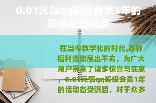 在当今数字化的时代,各种福利活动层出不穷,为广大用户带来了诸多惊喜与实惠,0.01元领qq超级会员1年的活动备受瞩目。
