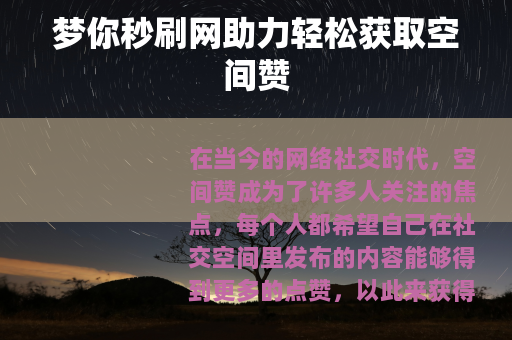 在当今的网络社交时代,空间赞成为了许多人关注的焦点,每个人都希望自己在社交空间里发布的内容能够得到更多的点赞,以此来获得他人的关注和认可,而梦你秒刷网的出现,为大家提供了一个轻松获取空间赞的途径。
