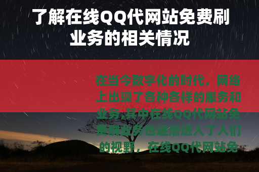 在当今数字化的时代,网络上出现了各种各样的服务和业务,其中在线QQ代网站免费刷业务也逐渐进入了人们的视野。