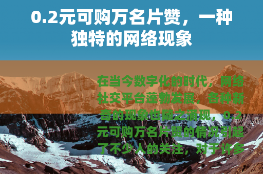 在当今数字化的时代,网络社交平台蓬勃发展,各种新奇的现象也随之涌现,0.2元可购万名片赞的情况引起了不少人的关注。