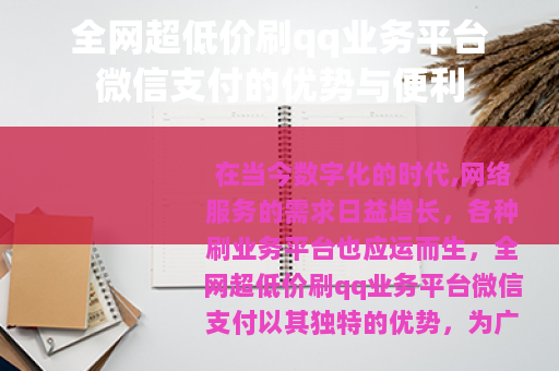 在当今数字化的时代,网络服务的需求日益增长,各种刷业务平台也应运而生,全网超低价刷qq业务平台微信支付以其独特的优势,为广大用户带来了诸多便利。