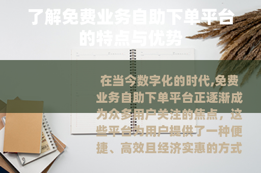免费业务自助下单平台为我们的生活和工作带来了诸多便利和机遇,我们要充分认识到其价值和优势,合理利用这些平台,同时也要注意相关的使用事项,以确保我们能够在享受便利的同时,保障自己的权益和利益,相信在未来,免费业务自助下单平台将会在我们的生活中发挥更加重要的作用,为我们创造更加美好的数字化生活体验。
