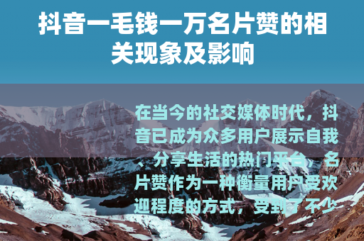 在当今的社交媒体时代,抖音已成为众多用户展示自我、分享生活的热门平台,名片赞作为一种衡量用户受欢迎程度的方式,受到了不少人的关注,而“抖音一毛钱一万名片赞”的现象也随之出现,引发了一系列值得探讨的话题。