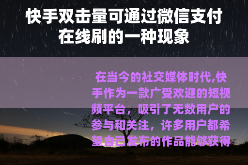 在当今的社交媒体时代,快手作为一款广受欢迎的短视频平台,吸引了无数用户的参与和关注,许多用户都希望自己发布的作品能够获得更多的双击量,以此来增加作品的热度和曝光度,而在这个需求的背后,出现了一种所谓的快手双击量在线刷且支持微信支付的服务。