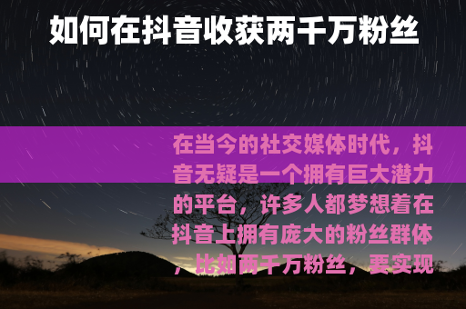 要在抖音上收获两千万粉丝并非一蹴而就的事情,需要坚持不懈地努力,不断优化自己的内容和运营策略,逐步积累人气和粉丝,才能在这个竞争激烈的平台上实现自己的目标,拥有令人瞩目的粉丝数量,在抖音的世界里绽放属于自己的光彩。