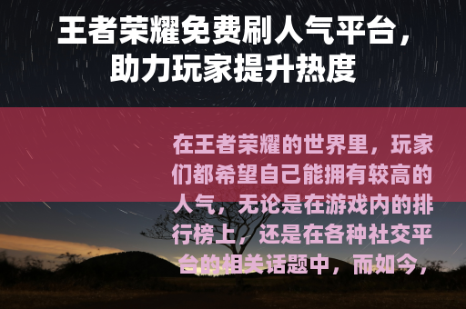 在王者荣耀的世界里,玩家们都希望自己能拥有较高的人气,无论是在游戏内的排行榜上,还是在各种社交平台的相关话题中,而如今,市场上出现了一些王者荣耀刷人气平台免费的服务,为广大玩家提供了一种新的途径来增加自己的人气值。
