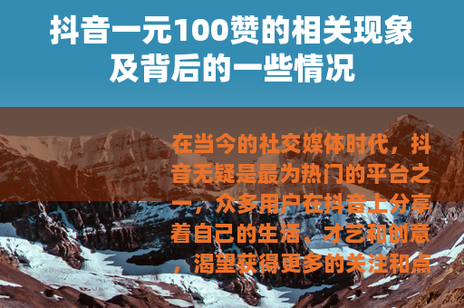 在当今的社交媒体时代,抖音无疑是最为热门的平台之一,众多用户在抖音上分享着自己的生活、才艺和创意,渴望获得更多的关注和点赞,而“抖音一元100赞”这样的现象也随之出现,引起了不少人的关注。
