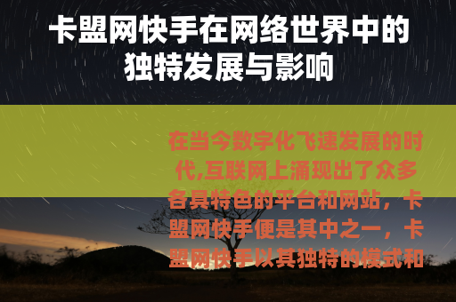 在当今数字化飞速发展的时代,互联网上涌现出了众多各具特色的平台和网站,卡盟网快手便是其中之一,卡盟网快手以其独特的模式和丰富的内容,在网络的广阔天地中占据了一席之地,为用户带来了别样的体验。