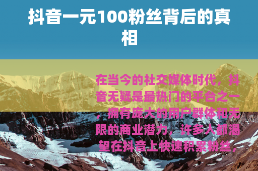 在当今的社交媒体时代,抖音无疑是最热门的平台之一,拥有庞大的用户群体和无限的商业潜力,许多人都渴望在抖音上快速积累粉丝,以提升自己的影响力和实现各种目标,而市场上也出现了一些声称可以一元购买100粉丝的服务,这看似极具吸引力的交易背后,究竟隐藏着怎样的秘密呢?