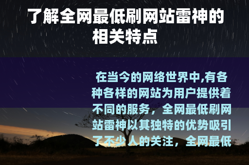 在当今的网络世界中,有各种各样的网站为用户提供着不同的服务,全网最低刷网站雷神以其独特的优势吸引了不少人的关注。