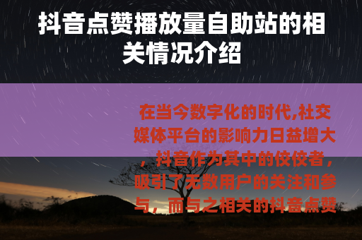 在当今数字化的时代,社交媒体平台的影响力日益增大,抖音作为其中的佼佼者,吸引了无数用户的关注和参与,而与之相关的抖音点赞播放量自助站也逐渐进入了人们的视野。
