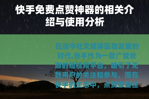 快手免费点赞神器是一个在短视频行业发展过程中出现的现象,它既有一定的吸引力,也存在诸多的问题和风险,用户和平台都需要正确认识和对待它,共同努力,才能让快手平台在健康、有序的轨道上不断发展壮大,为用户提供更好的服务和体验,让更多优秀的视频作品能够在这个平台上绽放光彩,实现其应有的价值。 你能满意,如果你还有其他修改意见或想法,欢迎随时告诉我,需要注意的是,在实际应用中,使用非官方认可的第三方工具来获取点赞等操作可能违反平台规定,我们应倡导通过合法合规的方式来发展和提升自己在平台上的影响力。
