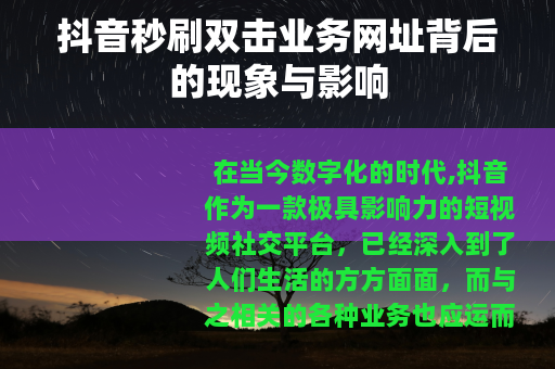 在当今数字化的时代,抖音作为一款极具影响力的短视频社交平台,已经深入到了人们生活的方方面面,而与之相关的各种业务也应运而生,其中抖音秒刷双击业务网址就是一个备受关注的话题。