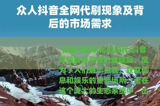 在当今数字化的时代,抖音等短视频平台迅速崛起,成为了人们展示自我、获取信息和娱乐的重要场所,而在这个庞大的生态系统中,出现了一种众人抖音全网代刷的现象,它在一定程度上影响着抖音平台的运营和发展,也反映出了一些值得关注的市场需求。