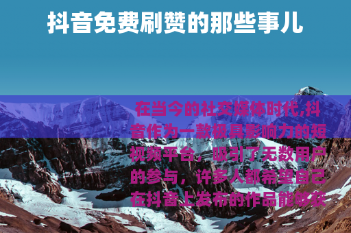 在当今的社交媒体时代,抖音作为一款极具影响力的短视频平台,吸引了无数用户的参与,许多人都希望自己在抖音上发布的作品能够获得更多的点赞,从而增加曝光度和人气,而“抖音免费刷赞最便宜”这样的话题也随之在一些网络角落里悄然兴起。