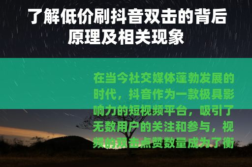 在当今社交媒体蓬勃发展的时代,抖音作为一款极具影响力的短视频平台,吸引了无数用户的关注和参与,视频的双击点赞数量成为了衡量一个视频受欢迎程度的重要指标之一,而在这个过程中,出现了一种所谓“低价刷抖音双击”的现象,引发了不少人的兴趣和讨论。