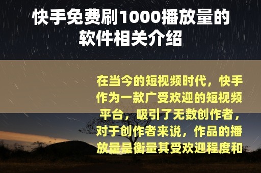 在当今的短视频时代,快手作为一款广受欢迎的短视频平台,吸引了无数创作者,对于创作者来说,作品的播放量是衡量其受欢迎程度和影响力的重要指标之一,很多人都希望能够找到一种方法来提高自己作品的播放量,而快手免费刷1000播放的软件便应运而生。