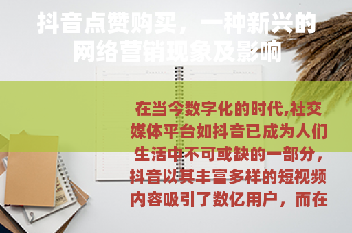 在当今数字化的时代,社交媒体平台如抖音已成为人们生活中不可或缺的一部分,抖音以其丰富多样的短视频内容吸引了数亿用户,而在这个庞大的生态系统中,抖音点赞购买逐渐成为一种备受关注的现象。