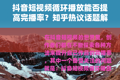 在抖音短视频的世界里,创作者们都在不断探索各种方法来提升自己作品的完播率,其中一个备受关注的问题就是:抖音短视频循环播放会提高完播率吗?这个问题在知乎等平台上引发了众多网友的热烈讨论。