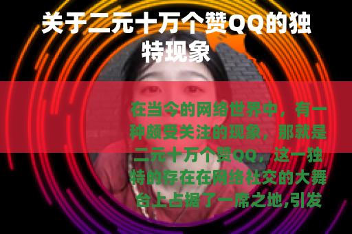 在当今的网络世界中,有一种颇受关注的现象,那就是二元十万个赞QQ,这一独特的存在在网络社交的大舞台上占据了一席之地,引发了众多用户的好奇与参与。