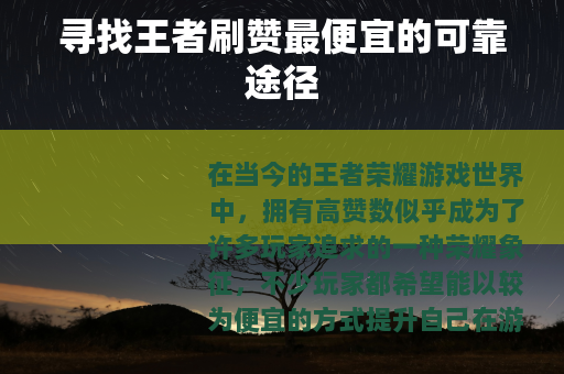 想要找到王者刷赞最便宜的途径需要玩家花费一定的时间和精力去探索和比较,但只要保持理性和谨慎,通过多种渠道的了解和尝试,是完全有可能在不花费太多金钱的情况下,实现王者账号点赞数量的显著提升,从而在游戏中获得更多的关注和认可,让自己的游戏之旅更加精彩和有成就感。
