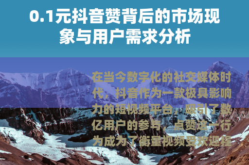 在当今数字化的社交媒体时代,抖音作为一款极具影响力的短视频平台,吸引了数亿用户的参与,点赞这一行为成为了衡量视频受欢迎程度的重要指标之一,而市场上出现的0.1元抖音赞的现象,也引发了广泛的关注和讨论。