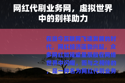 在当今互联网飞速发展的时代,网红经济蓬勃兴起,众多网红如璀璨星辰般在网络世界中闪耀,而与之相伴的,是一种名为网红代刷业务网的特殊存在,它在网络的角落里悄然生长,为网红们提供着一种别样的“助力”。