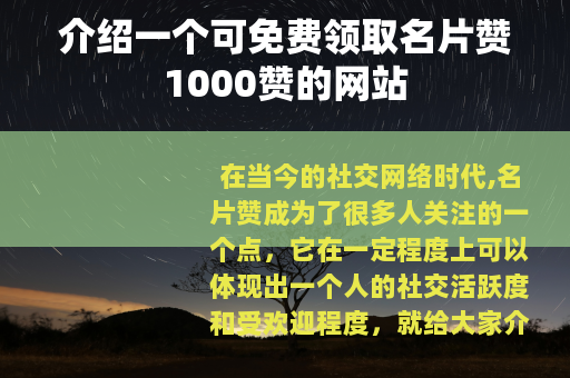 在当今的社交网络时代,名片赞成为了很多人关注的一个点,它在一定程度上可以体现出一个人的社交活跃度和受欢迎程度,就给大家介绍一个可以免费领取名片赞1000赞的网站。