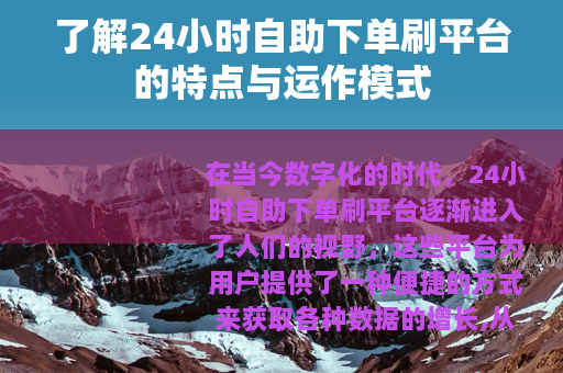 在当今数字化的时代,24小时自助下单刷平台逐渐进入了人们的视野,这些平台为用户提供了一种便捷的方式来获取各种数据的增长,从而在一定程度上满足了部分用户对于提升自身网络影响力的需求。