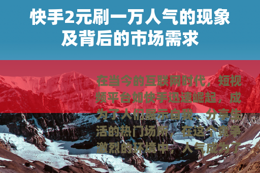 在当今的互联网时代,短视频平台如快手迅速崛起,成为了人们展示自我、分享生活的热门场所,在这个竞争激烈的环境中,人气成为了众多用户追求的目标之一,而“快手2元刷一万人气”的现象也随之悄然出现。