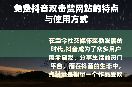 在当今社交媒体蓬勃发展的时代,抖音成为了众多用户展示自我、分享生活的热门平台,而在抖音的生态中,点赞量是衡量一个作品受欢迎程度的重要指标之一,免费抖音双击赞网站应运而生,为许多希望提升自己作品热度的用户提供了一种途径。