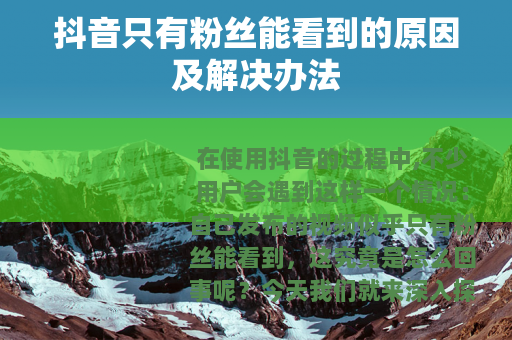 在使用抖音的过程中,不少用户会遇到这样一个情况:自己发布的视频似乎只有粉丝能看到,这究竟是怎么回事呢?今天我们就来深入探讨一下这个问题及其背后的原因,并提供一些相应的解决方法。