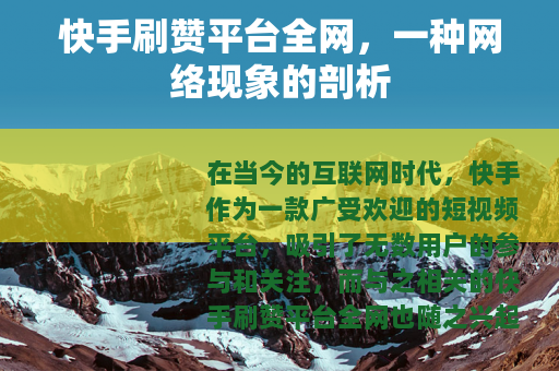 在当今的互联网时代,快手作为一款广受欢迎的短视频平台,吸引了无数用户的参与和关注,而与之相关的快手刷赞平台全网也随之兴起,成为了一个值得探讨的网络现象。