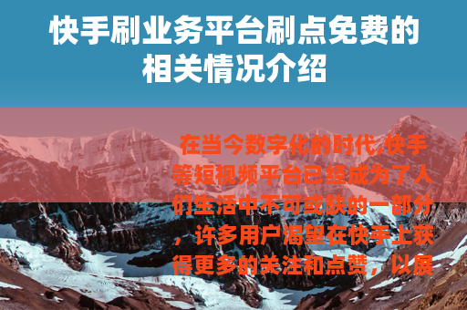 在当今数字化的时代,快手等短视频平台已经成为了人们生活中不可或缺的一部分,许多用户渴望在快手上获得更多的关注和点赞,以展示自己的才华或推广自己的产品和服务,在这样的背景下,快手刷业务平台刷点免费的现象逐渐进入了人们的视野。