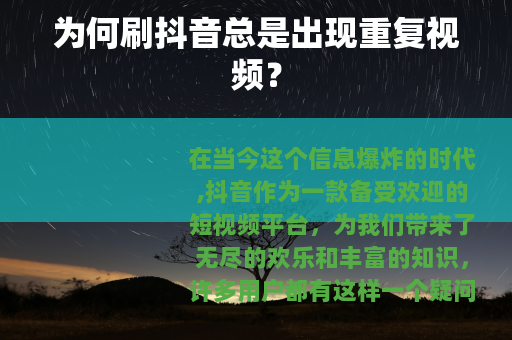 在当今这个信息爆炸的时代,抖音作为一款备受欢迎的短视频平台,为我们带来了无尽的欢乐和丰富的知识,许多用户都有这样一个疑问:为啥刷抖音都是重复视频呢?